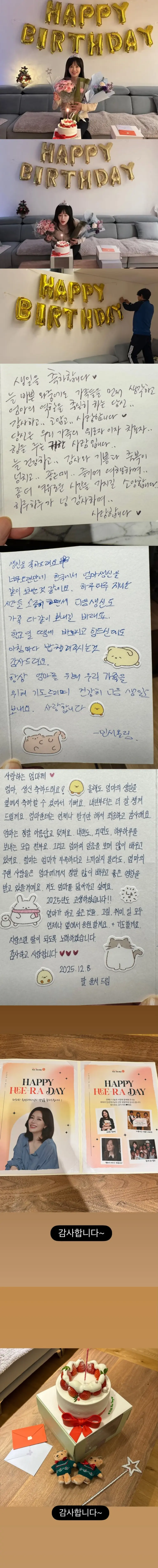 아들 민서 군은 "다음 생신도 가족 다 같이 보내길 바란다. 학교 일 때문에 바쁘시고 힘드신대도 아침마다 밥 챙겨주시는 것 감사드린다. 항상 엄마를 위해, 우리 가족을 위해 기도 드리며 선강히 다음 생일 보내요. 사랑합니다"라며 진심을 전했다.
