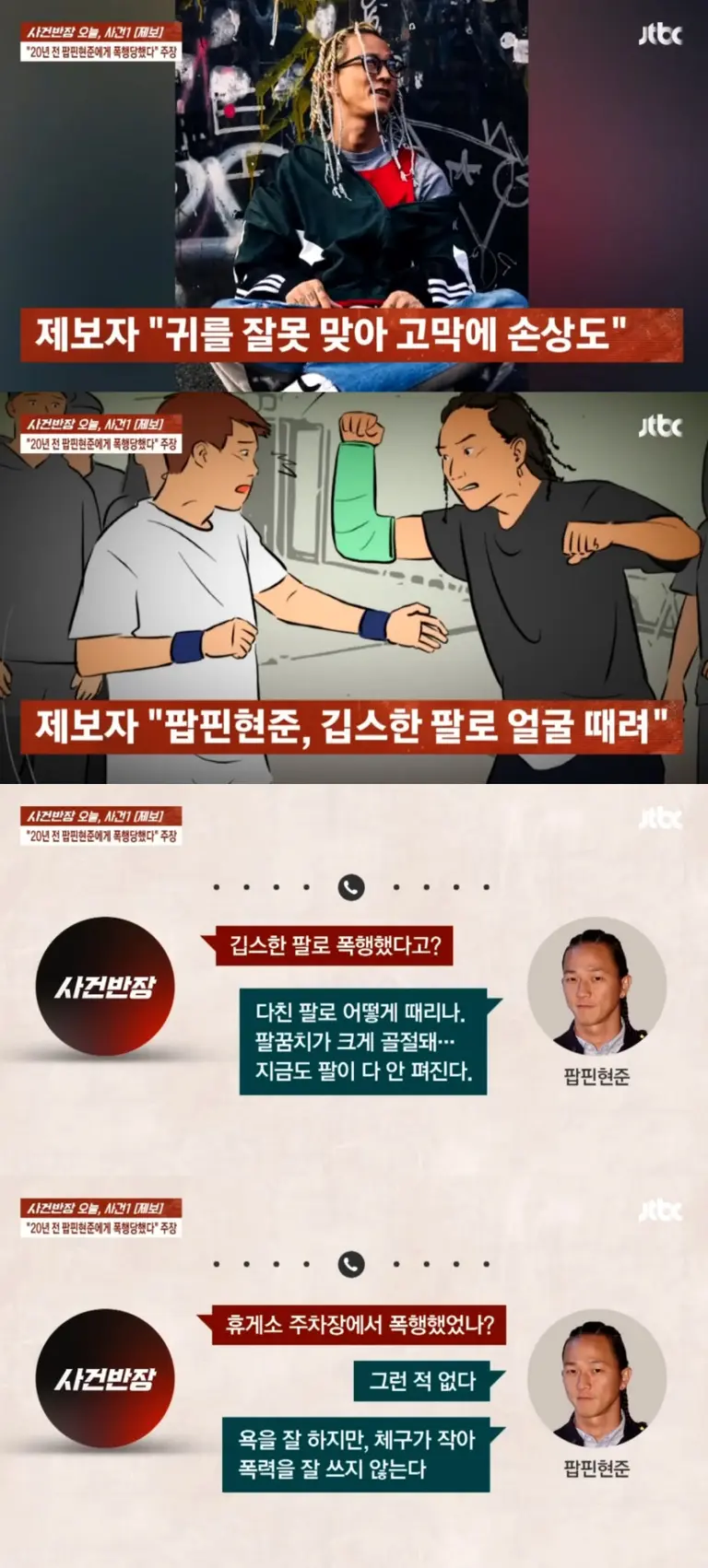 이에 대해 팝핀현준은 관련 의혹을 전면 부인했다. 그는 사건반장을 통해 당시 팔꿈치가 크게 골절되어 현재까지도 팔이 다 펴지지 않는데 어떻게 깁스한 팔로 사람을 때릴 수 있겠느냐고 반문했다. 또한 평소 욕설은 할지언정 체구가 작아 폭력을 쓰지는 않는다고 해명했다.