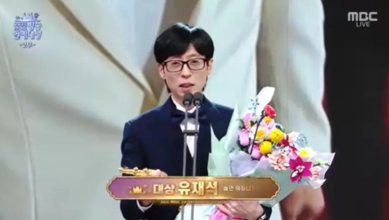 시상대에 오른 유재석은 뭐라고 감사의 말씀을 드려야 할지 모르겠다며 벅찬 소감을 전했다. 그는 부모님과 장인어른, 장모님께 감사를 표한 뒤 항상 든든한 고마운 존재인 아내 나경은 씨에게도 진심 어린 마음을 전했다. 또한 프로그램을 함께 만드는 PD와 작가, 현장에서 고생하는 수많은 제작진에게 영광을 돌렸다.